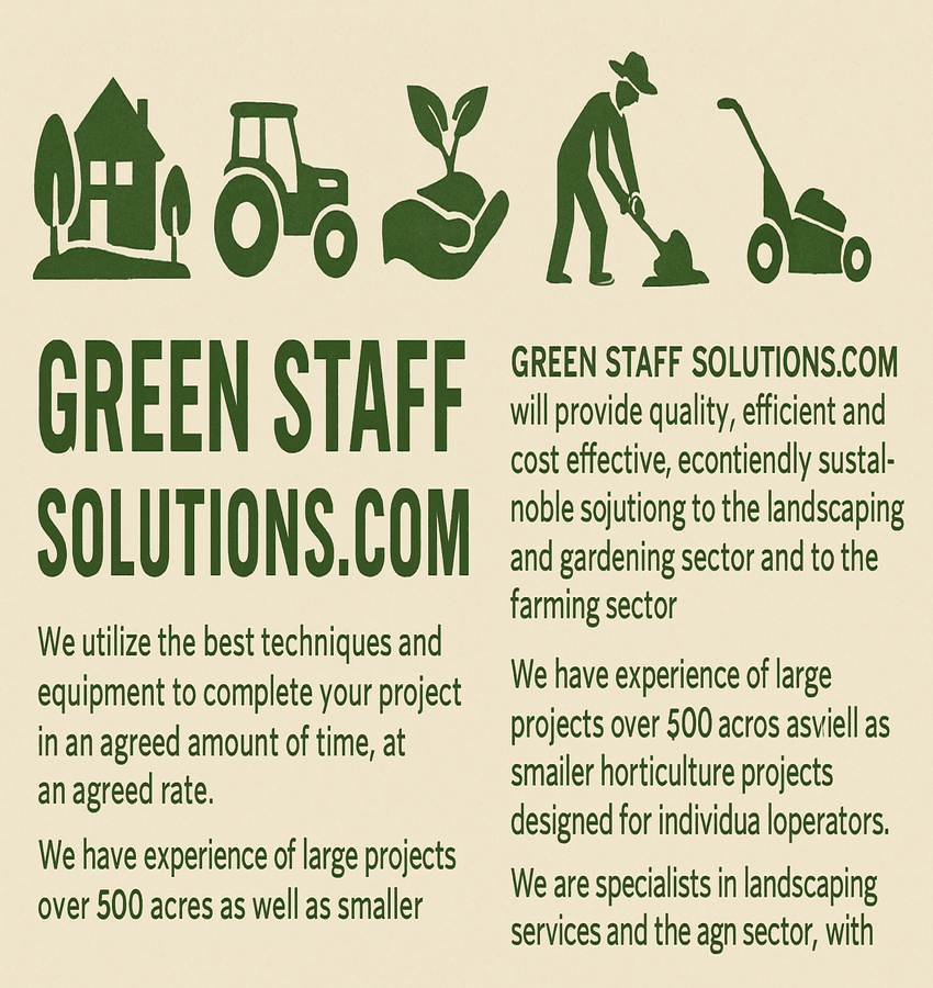 - “GREEN STAFF SOLUTIONS.COM will provide quality , efficient and cost effective , eco-friendly sustainable solutions to the lansacping and gardening sector and to the farming sector. we utilise the best techniques and equipment to complete your project in an agreed amount of time, at an agreed rate”
